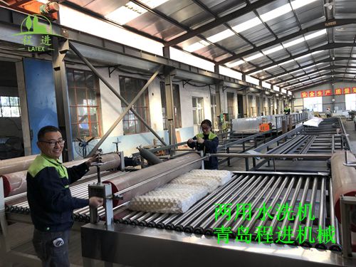 工作原理是通過水洗滾壓將乳膠制品中的雜質去除,達到完美的新產品。有些國家的客戶他們生產的乳膠枕頭,沒有經過水洗這一環節,產量質量度就下降了很多。最初水洗機設計的時候,將乳膠產品單獨分開來清洗,清洗乳膠枕頭的水洗機比較小一些,床墊的水洗機較大,